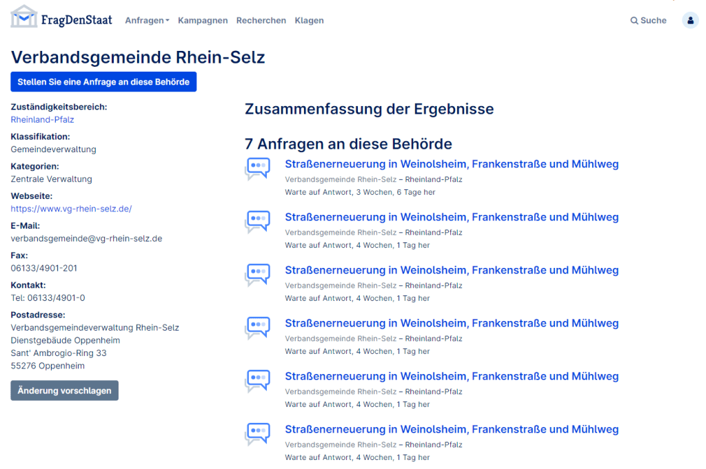 Daher erfolgten Anfragen an die Verbandsgemeinde Rhein-Selz über die Transparenzplattform FragDenStaat: